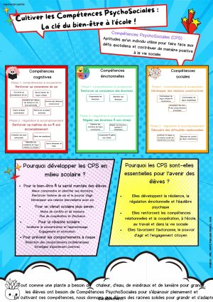 Infographies Compétences PsychoSociales : développer gestion du stress, relations positives et prise de décision pour un meilleur bien-être et climat de classe.