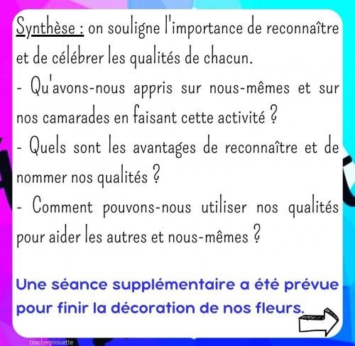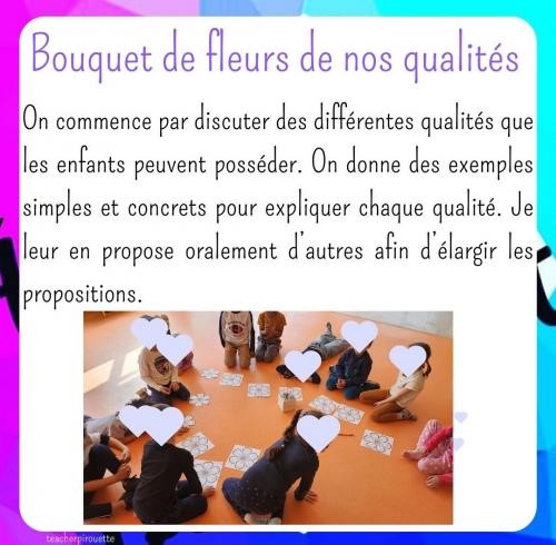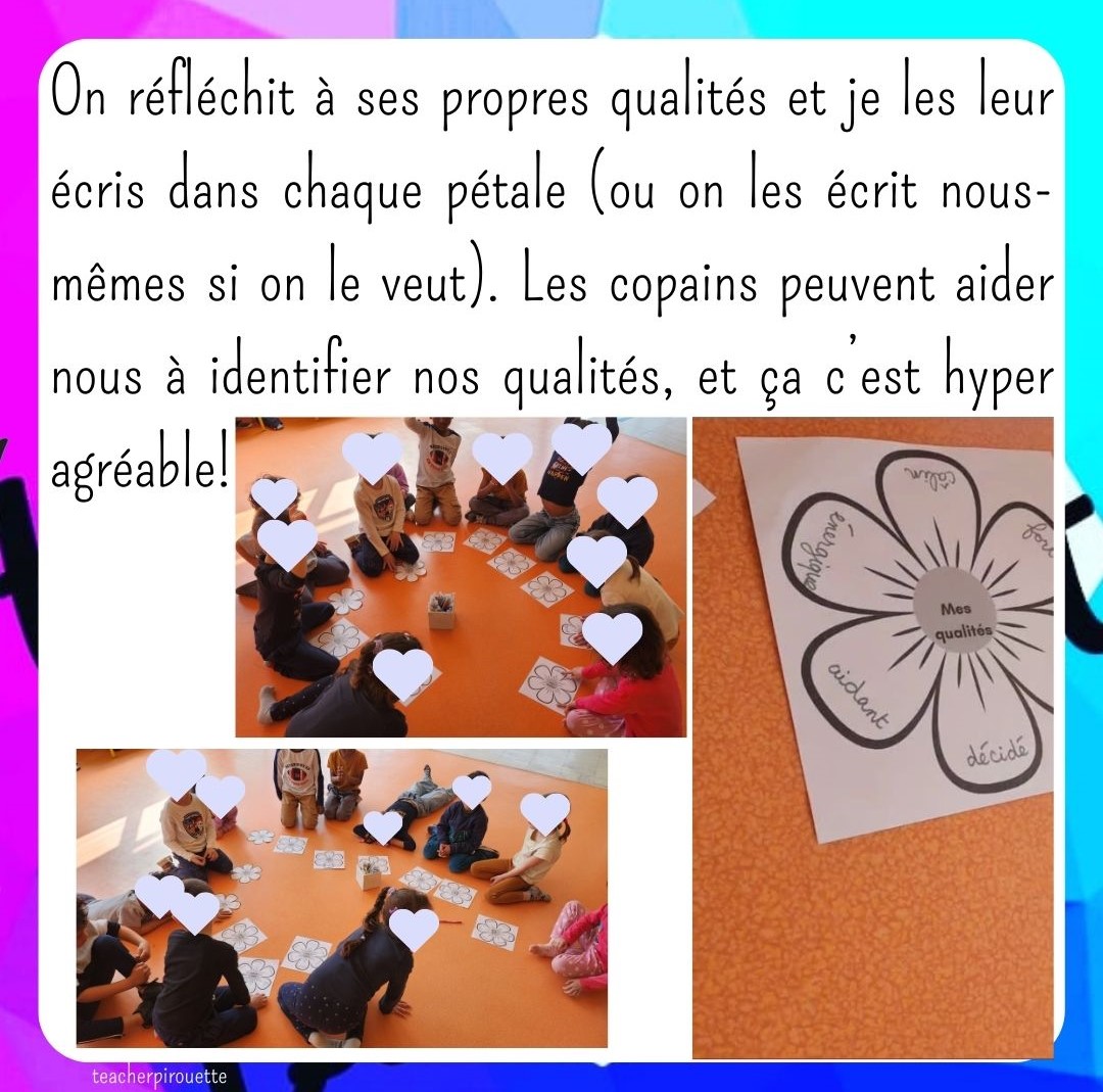 L’idée centrale est adaptée d’une séance proposée sur le site du cartablecps.org : la fleur des qualités.