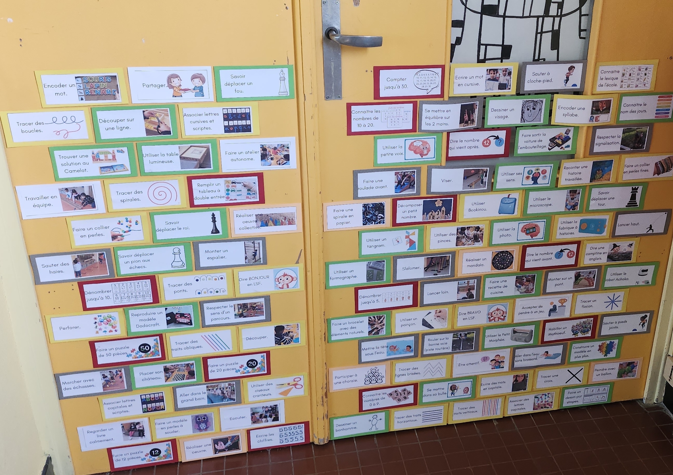 Le mur des apprentissages est une initiative éducative créative qui implique les élèves dans la construction visuelle et symbolique de leur progression. Concrètement, c’est un mur physique (ou ici, une double porte) où une brique représente un apprentissage spécifique ou une compétence acquise (par une majorité au moins).